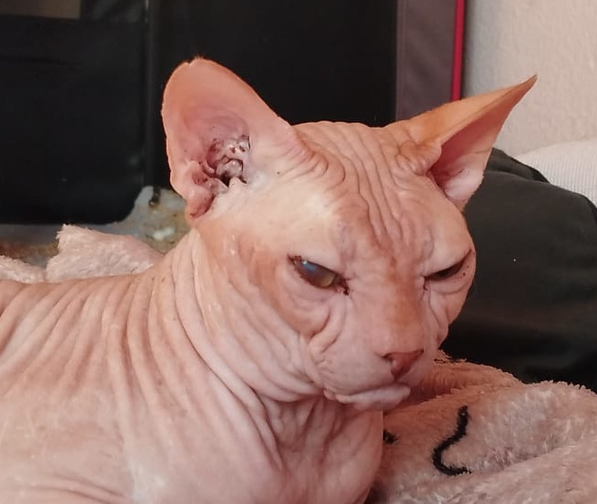 Der ca. 10-jährige Ramses (Nacktkatze) wurde einfach an einer Futterstelle ausgesetzt und seinem Schicksal überlassen. Als er gefunden wurde, war sein Zustand lebensbedrohlich. Er hat nur knapp überlegt.