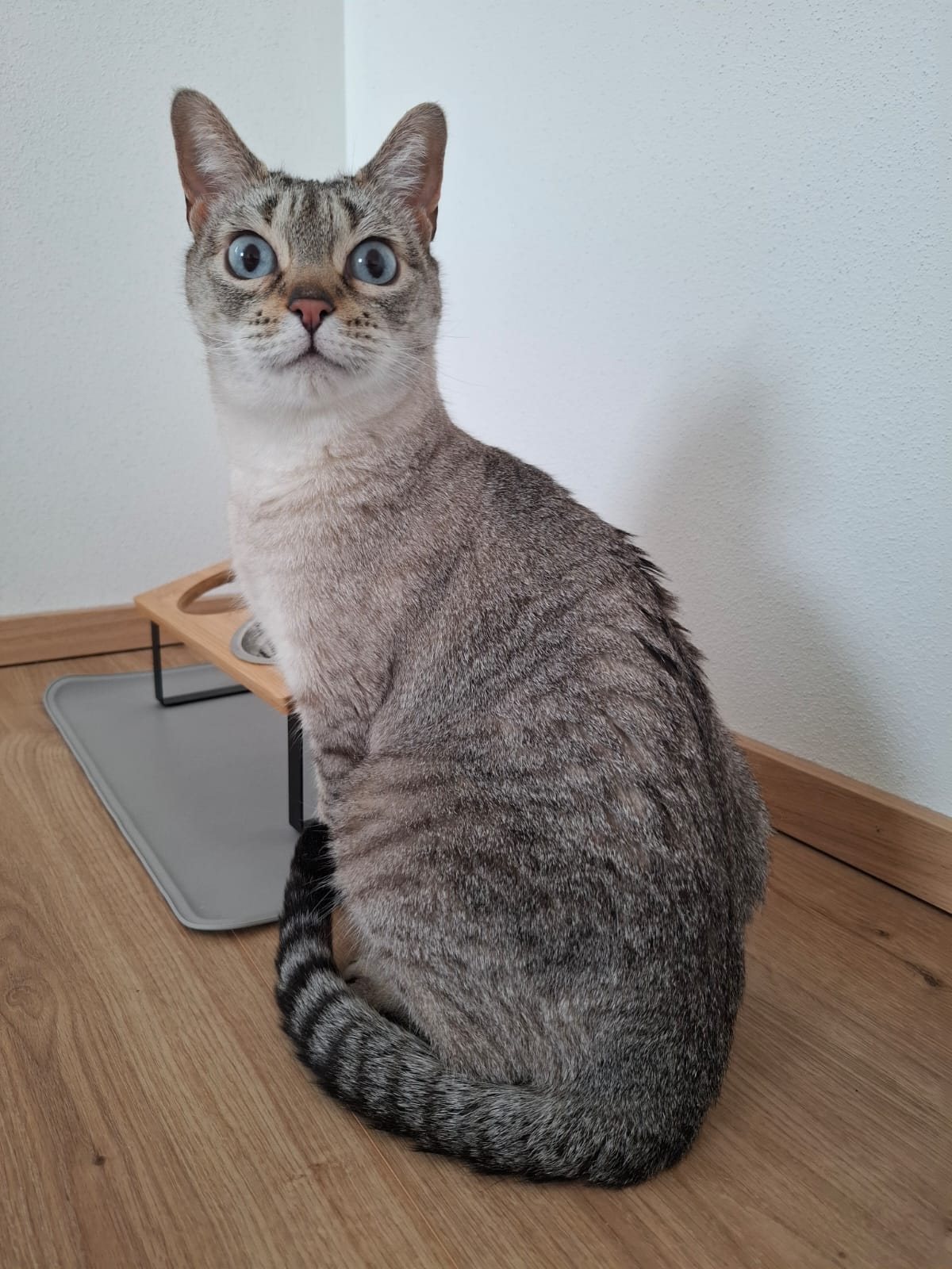 Cadi (geb. ca. 12/2024) ist eine menschenbezogene, zutrauliche Kätzin, die beim Menschen gern im Mittelpunkt steht.
