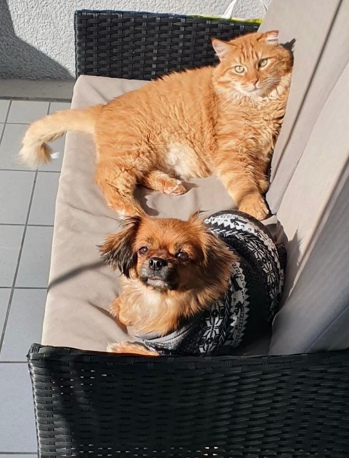 Momo hatte einige Zeit mit einem Kater zusammengelebt, hat ihn auch problemlos akzeptiert, aber sie lebten eigentlich nur in friedlicher Koexistenz. Mit anderen Hunden (unterwegs) hat er keine Probleme, aber hier kommt es auch auf Sympathie an.
