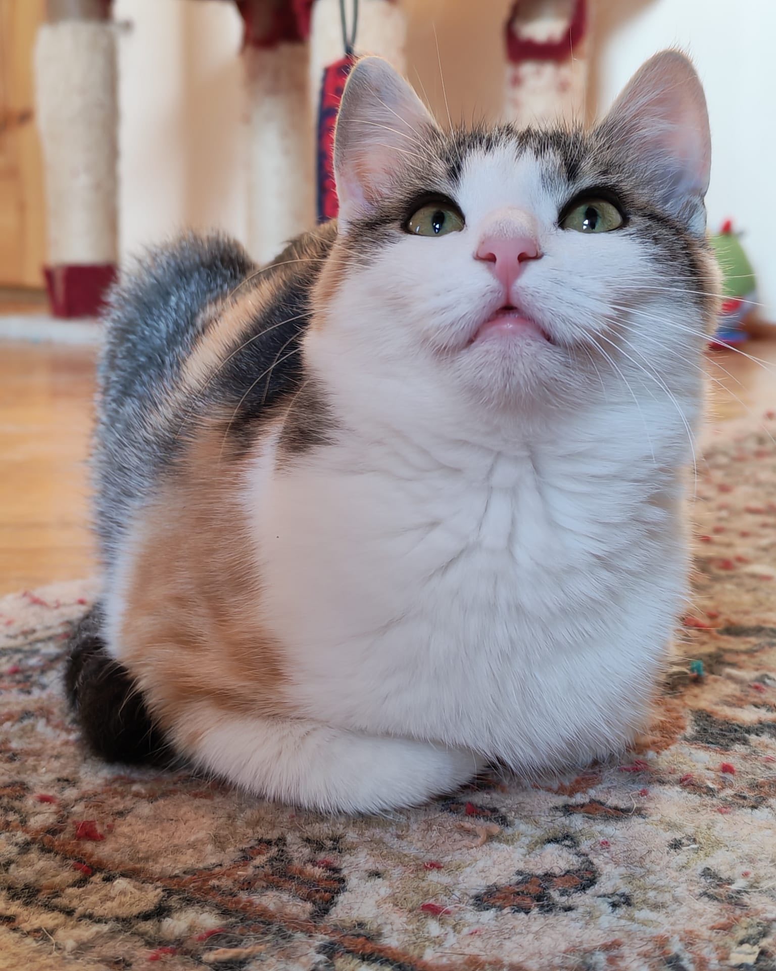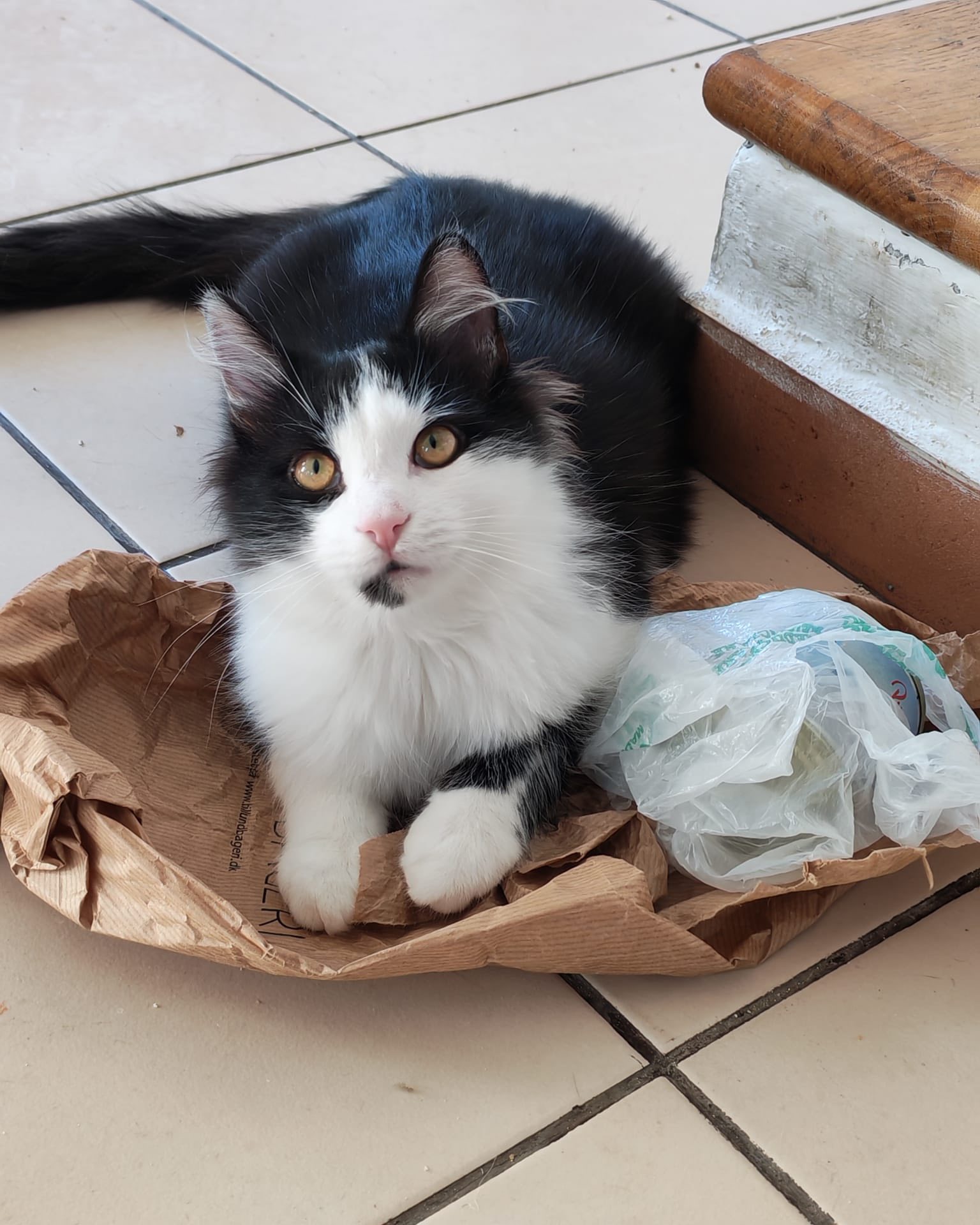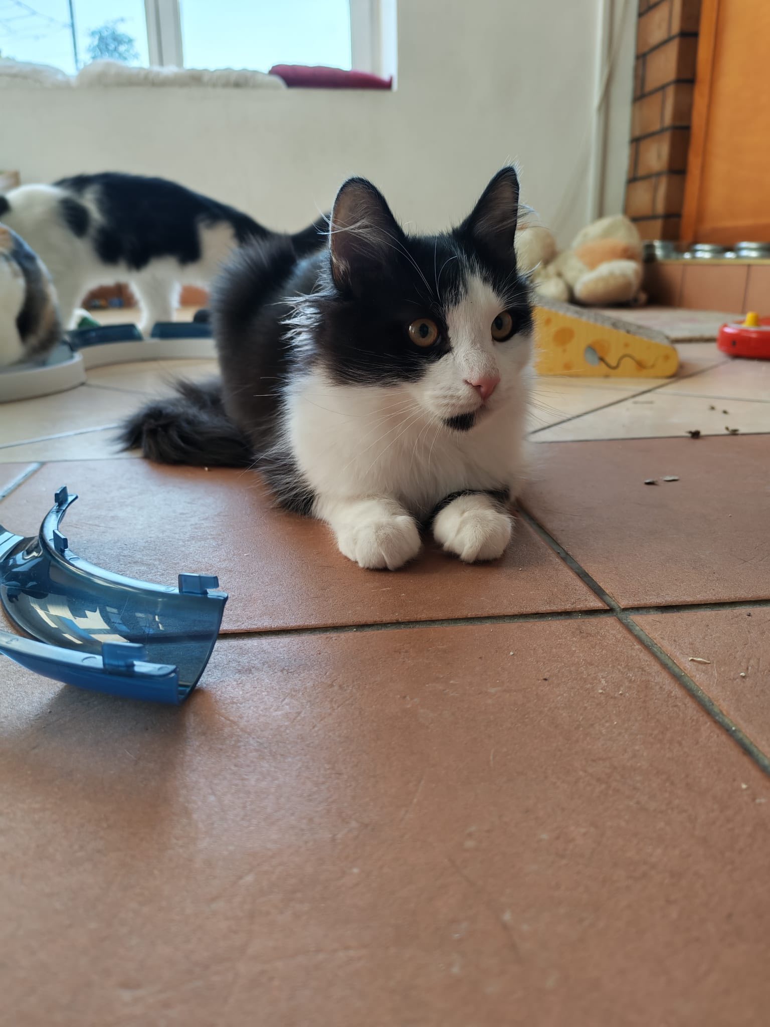 Er ist so wunderschön. Sein längeres Fell, der sanfte Blick, die Art, wie er schmust, einfach unwiderstehlich. Er ist sehr ruhig und könnte ewig schmusen. Er sucht die Nähe seiner Geschwister und ist ein sehr sozialer Kater.