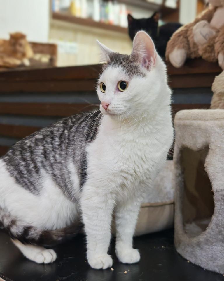 Ich bin sanft, sehr zutraulich und freundlich zu Katzen und Hunden und anhänglich zu Menschen. Mein Fell hat eine sehr harmonische grau-weiße Farbe und ist so wunderschön. Ich bin verspielt und neugierig. Nach einem schönen Spieltag kuschle ich mit Freunden hier in der Praxis . Ich würde auch so gerne in den Armen eines Menschen schmusen, aber die Tierärztin hat nicht so viel Zeit für jeden von uns. Ich bin anpassungsfähig und ich sehne mich in ein eigenes liebevolles Zuhause zu ziehen.