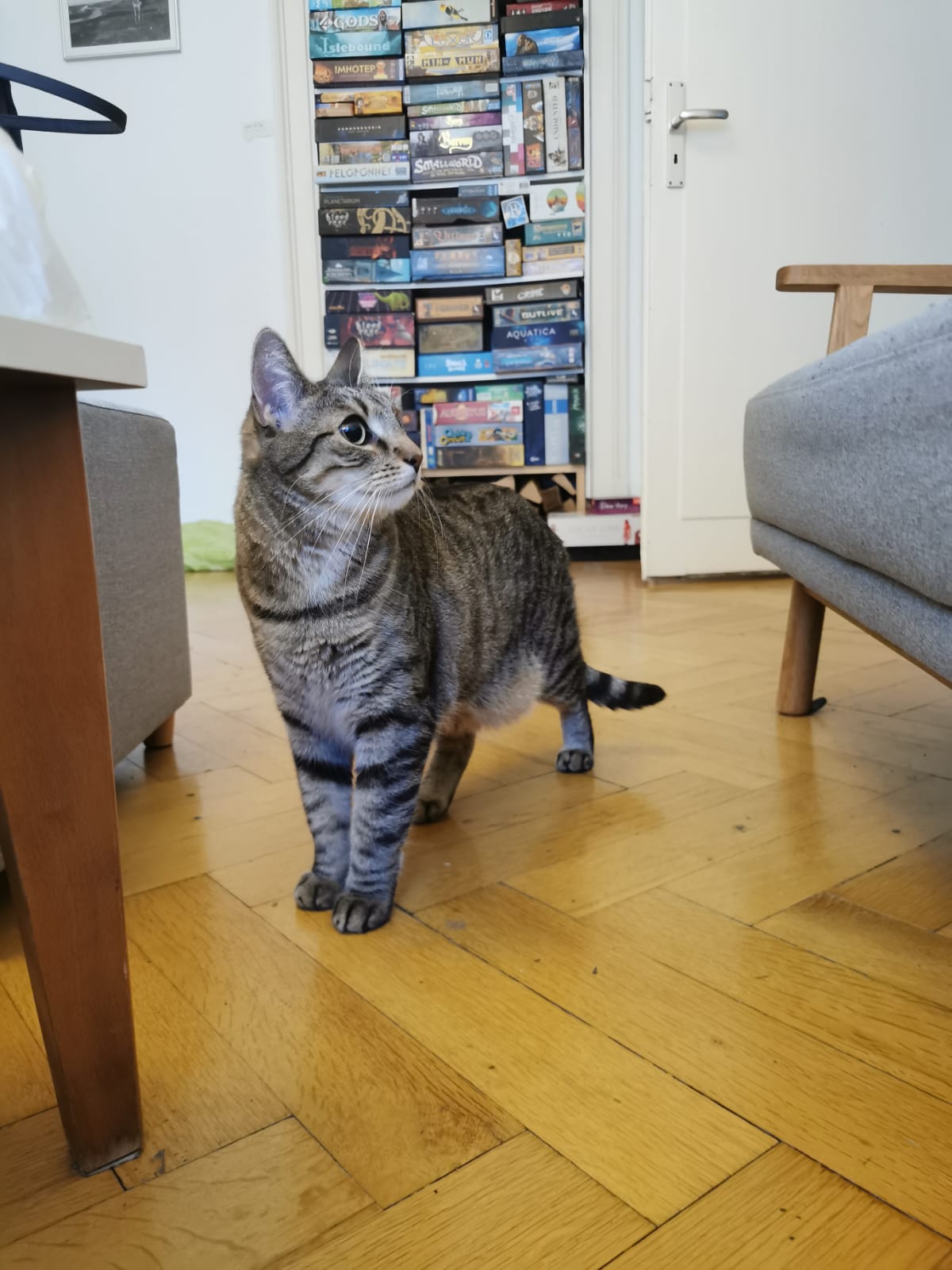 Miezi ist ein grau/brauner Tiger. Sie ist Menschen bezogen, verschmust und etwas ruhiger als Emma.