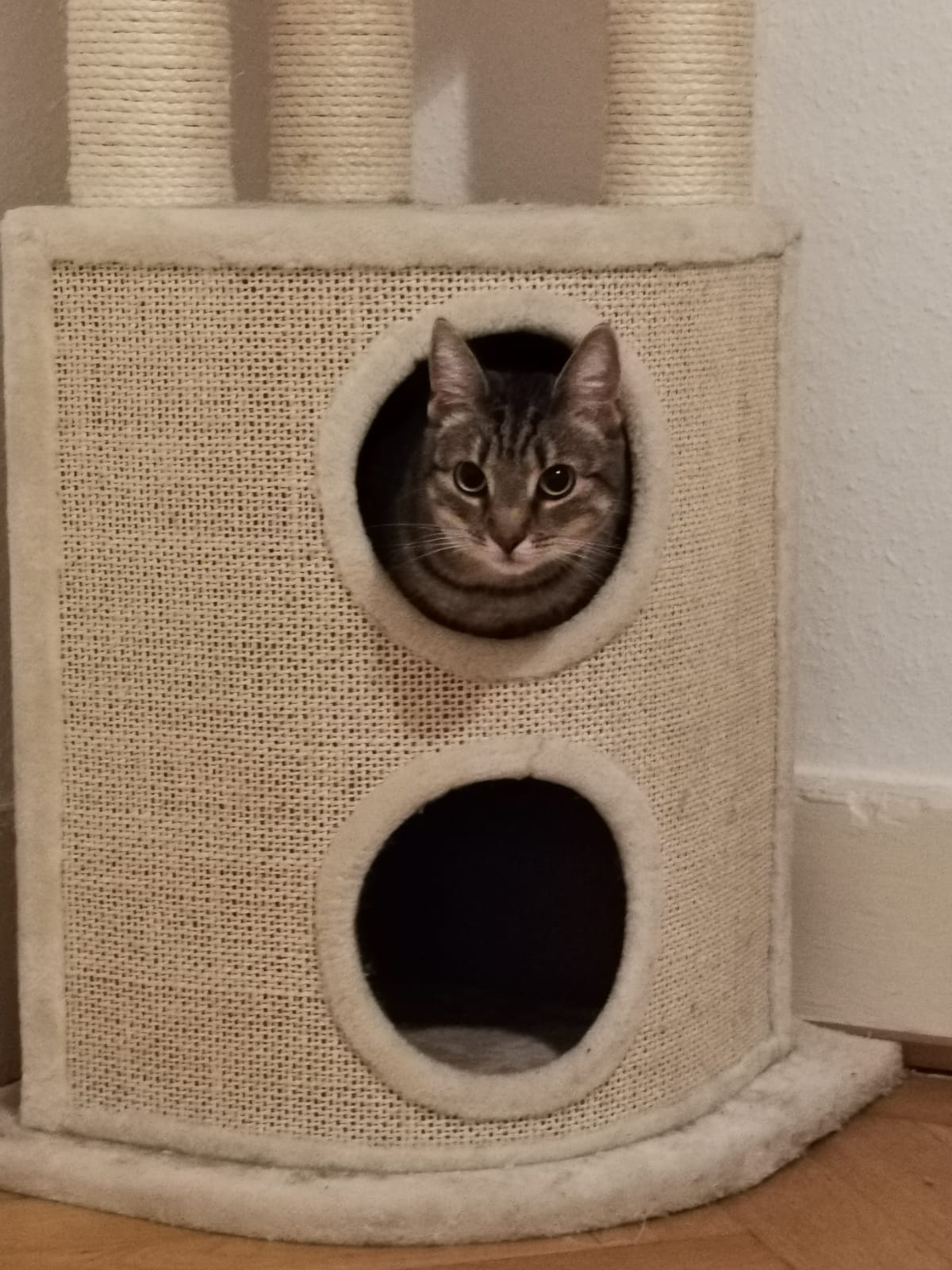 Die zwei bringen alles mit was zu einer Katzen Grundausstattung gehört: Kratzbäume, Klos, Spielzeug, Schlafhöhlen und Kissen etc.