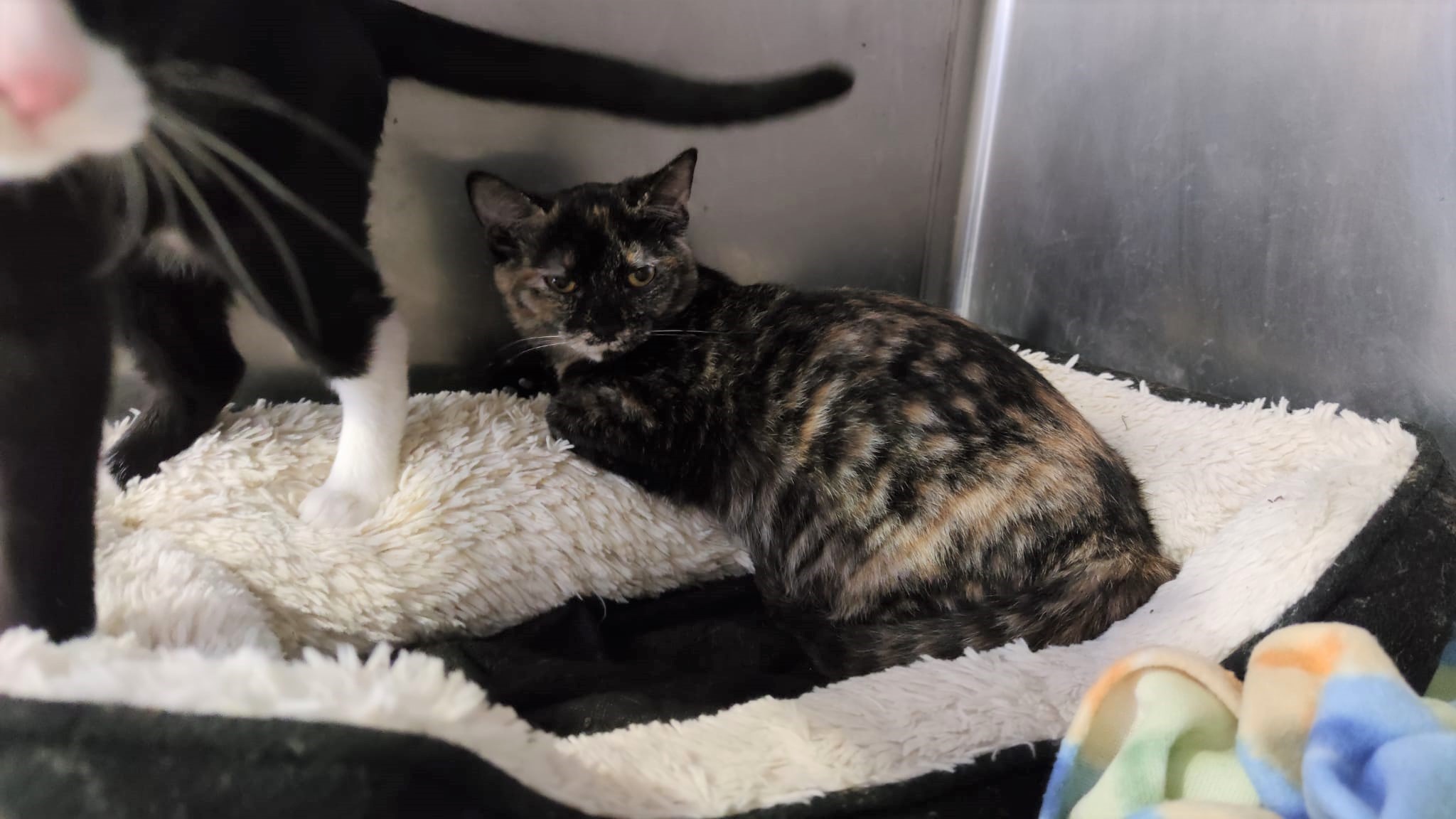 Die kleine Schildpattkatze Sirena, geb. 05/2020, ist ebenfalls ein Fundkätzchen. Sie war recht verängstigt und abgemagert als sie ins Tierheim kam. Sirena ist Menschen gegenüber immer noch zurückhaltend und schaut sich alles erst einmal mit sicherem Abstand an. Sie orientiert sich sehr an Wendy.