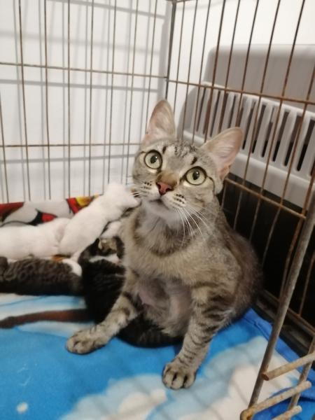Hier kommt die kleine und zarte Gala, die man mit ihren Kitten auf der Straße gefunden hat, vermutlich ausgesetzt, da nicht kastriert und prompt schwanger. Ihre Babies sind mittlerweile von ihrer Mama weg und so sucht Gala nun nach einem neuen Zuhause.