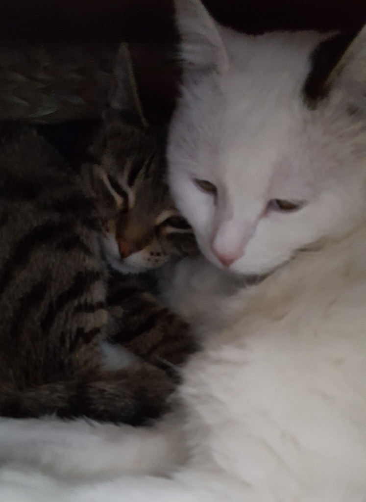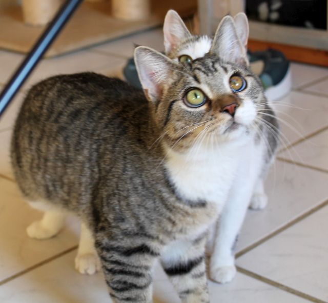 Amy, getigert mit viel weiß und Leo, getigert mit weißen Füßen und weißer Brust, geb. 09/2017, wurden mit Ihren Geschwistern in einem katastrophalen Gesundheitszustand bei meinem Tierarzt abgegeben, obwohl Sie in einem Haushalt geboren wurden! Aussage der „Halterin“, Sie hätten Das erst seit gestern! Zufällig war ich an dem Tage anwesend und sah die 3, Sie waren mehr tot als lebendig, unterkühlt, unterernährt, total verschnupft und „Mitbewohner“ hatten Sie auch reichlich! Für 1 Katzenkind kam jede Hilfe leider zu spät ABER die Beiden haben es wirklich überlebt auch wenn Leo eine Verfärbung des Augapfels hat, was IHN keineswegs beeinträchtigt, Er kommt damit super zurecht und Folgekosten sind lt. Tierarzt auch nicht zu erwarten! Er ist eine absolute Schmusebacke, was man leider bisher nicht von Seiner Schwester sagen kann! Amy hat das Erlebte offensichtlich noch nicht überwunden, zu groß war die Angst und die Enttäuschung vom Menschen! Amy ist vorsichtig, lässt sich streicheln, ist aber immer „auf der Hut“. Liegt Sie in einer Kuschelhöhle, kann man Sie gut streicheln, dann klappt auch, ohne Panik, auf den Arm! Sie liebt Ihren Bruder abgöttisch, Er gibt Ihr Halt! Gibt es für Sie geduldige Menschen, Die Ihr alle Zeit der Welt geben und Ihr zeigen dass es auch liebe Menschen gibt? Ein ruhiger Haushalt ohne Kinder wäre in diesem Fall sinnvoll. Die Beiden werden NUR zusammen und NUR in reine Wohnungshaltung mit gesicherten Balkon abgegeben!