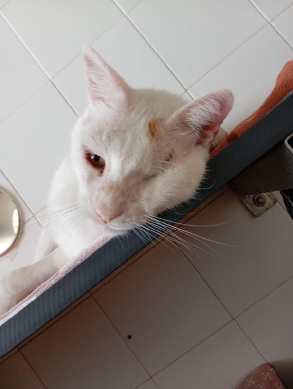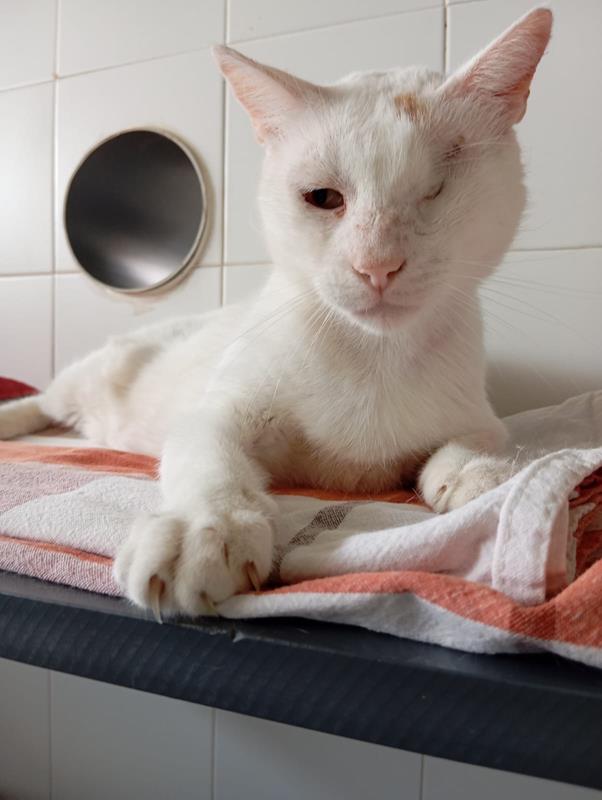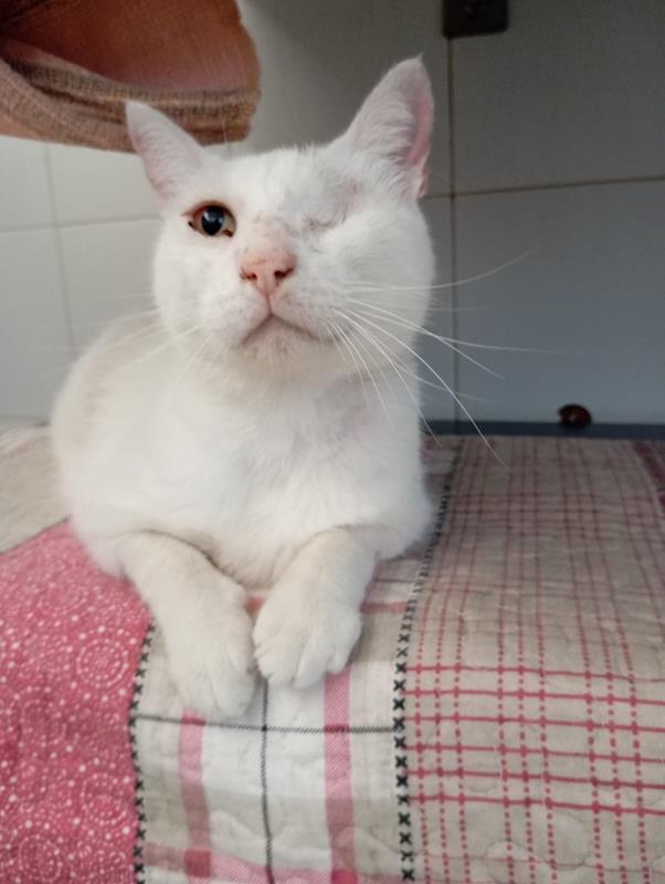 Pirata stammt ursprünglich aus einer Katzenkolonie, kam mit schwerer Augenentzündung ins Tierheim, leider konnte sein Auge nicht gerettet werden und musste entfernt werden.