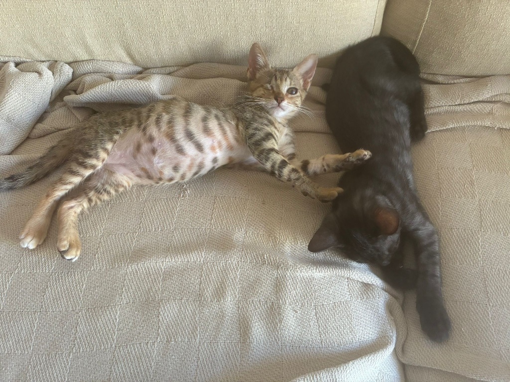 Mandy (rauchschwarz, Kater, geb. 05/2025) und Milla (Grautiger, 1 Auge, Kätzin, geb. ca. 06/2025 ) sind zwei junge Katzen, welche sich auf der Pflegestelle bei Tarragona kennen und lieben gelernt haben.