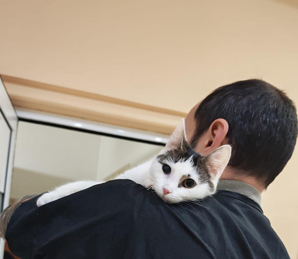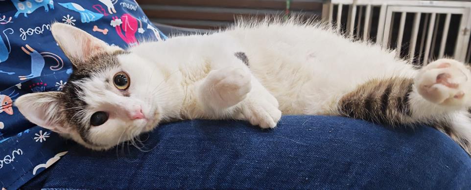 Ich wurde auf der Straße gefunden, ausgesetzt und in einer Tierarztpraxis abgegeben. Als man mich fand, war ich sehr mager, schwach und hatte bereits ein „kaputtes“ Auge. Das Sehvermögen meines rechten Auges ist beeinträchtigt, aber es tut gar nicht weh, und mir macht es gar nichts aus. Die Tierärztin misst regelmäßig meinen Augeninnendruck, und der ist immer normal.