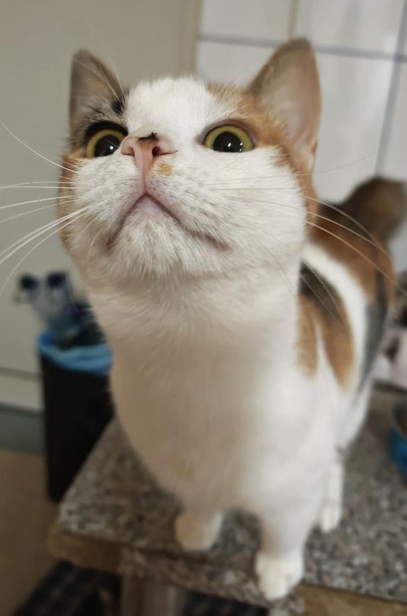 Ich bin eine süße und hübsche Katze. Auf meiner Nase habe ich einen kleinen Schönheitsfleck, der mir einen besonderen Charme verleiht. Ich bin unkompliziert, sehr liebevoll, anhänglich und reibe mich an den Beinen aller Menschen, um gestreichelt zu werden. Ich spiele gerne mit anderen Katzen und liebe sie, ich kuschele gerne mit ihnen, ich liebe ihre Gesellschaft. Ich kenne auch Hunde, hier in der Tierarztpraxis, wo ich vorübergehend wohne, habe ich viele kennengelernt.