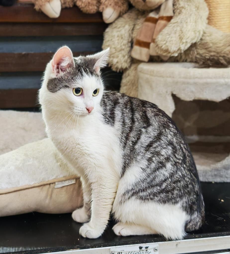 Ich bin sanft, sehr zutraulich und freundlich zu Katzen und Hunden und anhänglich zu Menschen. Mein Fell hat eine sehr harmonische grau-weiße Farbe und ist so wunderschön. Ich bin verspielt und neugierig. Nach einem schönen Spieltag kuschle ich mit Freunden hier in der Praxis . Ich würde auch so gerne in den Armen eines Menschen schmusen, aber die Tierärztin hat nicht so viel Zeit für jeden von uns. Ich bin anpassungsfähig und ich sehne mich in ein eigenes liebevolles Zuhause zu ziehen.